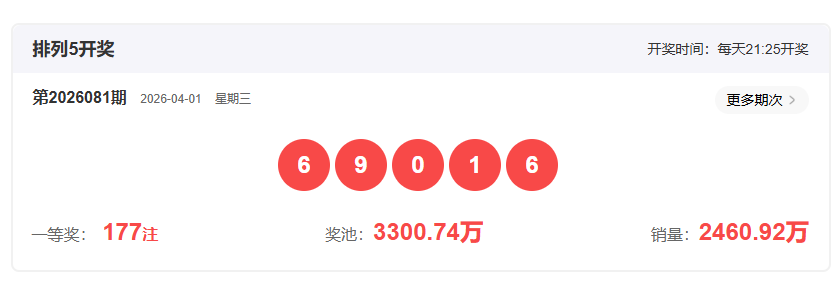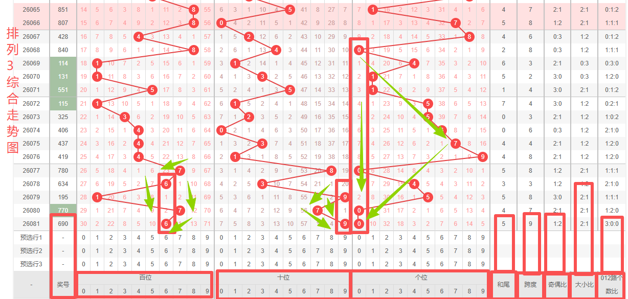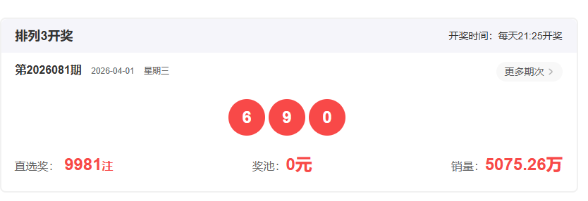 体彩排列3第2026081开奖号码690,形态为组六,奇偶比1:2,和值15,跨度9,大小比2:1,【012】路个数比3:0:0。