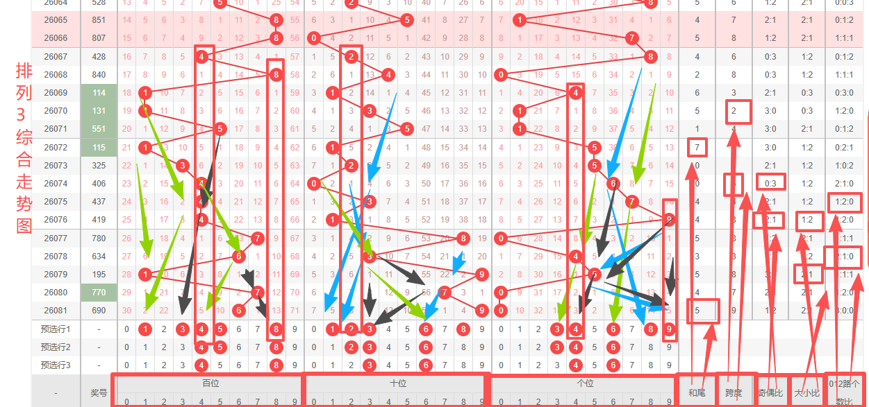 本期百位开出邻号、偶数号码【6】,近十五期百位开出号码为:【4-8-1-1-5-1-3-4-4-4-7-6-1-7-6】,开出奇偶比是:【偶偶奇奇奇奇奇偶偶偶奇偶奇奇偶】的态势,近十五期开出8:7的奇偶比,开出偶数号码,从比例看偶数占优势,奇偶比处于基本平衡之势,大小比为:【小大小小大小小小小小大大小大大】的态势,开出大号号码,大小比为6:9,小号占据优势,大小比处于失衡之势,百位开出跨度1,开出奇跨。