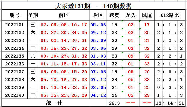 上期回顾,大乐透第2022140开奖,本期奖号:前区05 15 25 26 29;后区04 112,当期前区号码大小比为3:2,三区比1:1:3,奇偶比4:1。前区开出连号25 26,未开出重号。