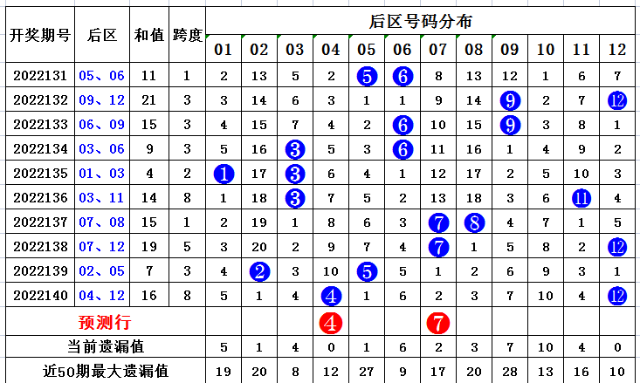 后区分析:上期开出号码04 12,近10期跨度1、3、3、3、2、8、1、5、3、8,推荐跨度3,本期推荐5码:01 04 07 09 12,精选推荐04 07