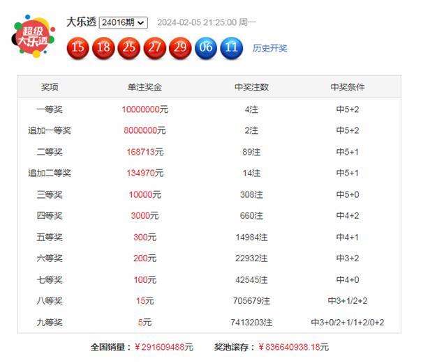 上期开奖:大乐透第2024016期开奖号码为:15、18、25、27、29+06、11。