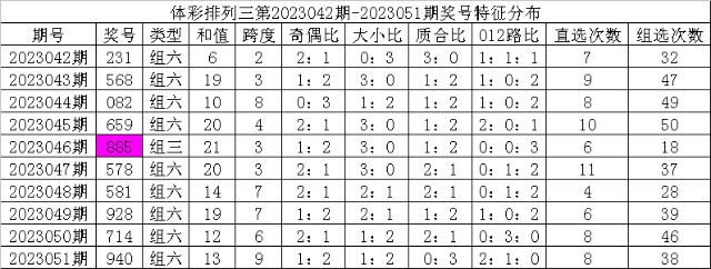 开奖公告:体彩排列三第2023051期开出奖号:940。组六,有重号:4,奇偶比1:2,大小比1:2,012比2:1:0,和值13,跨度9。