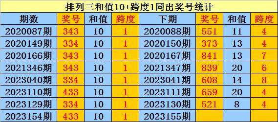 排列三近8次和值10+跨度1同出时奖号为:343、334、343、343、334、433、334、433,下期分别出现:551、373、841、839、608、659、521。