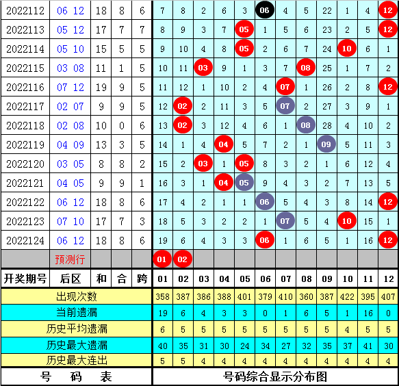 上期后区开出号码:06+12,全偶组合、全0路组合、一大一小组合。本期后区防0路号断档,两码看好01、02。