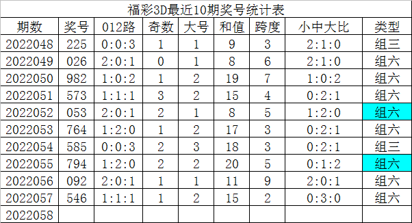 开奖回顾:福彩3D第2022057期奖号开出546。奖号类型为:组六,大小比为2:1,奇偶比为1:2,和值为15。