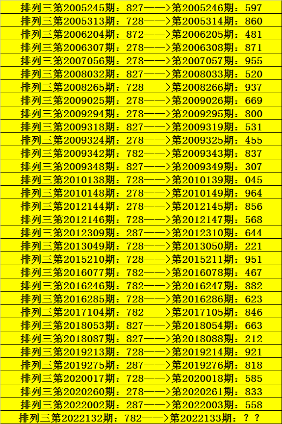 第2022132期排列三奖号为782,历史上该号码直选出现5次,下期奖号分别为:837、467、882、846。