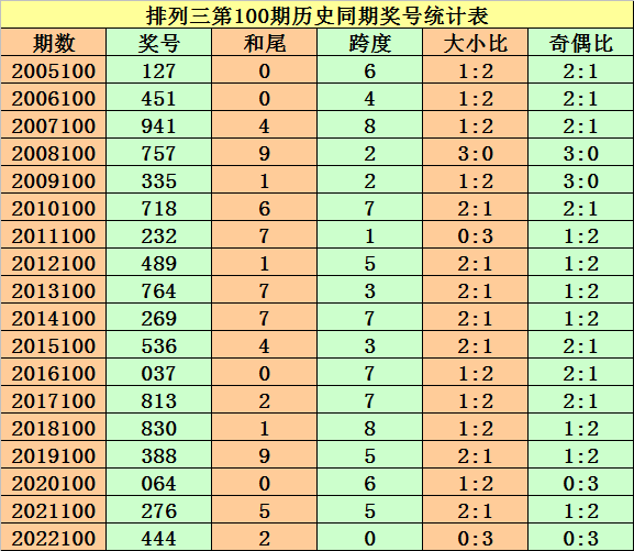 历年第100期排列三同期奖号开出:127、451、941、757、335、718、232、489、764、269、536、037、813、830、388、064、276、444。