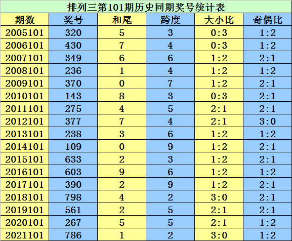 历年第101期排列三同期奖号开出:320、430、349、236、370、143、275、377、238、109、633、603、390、798、561、267、786。