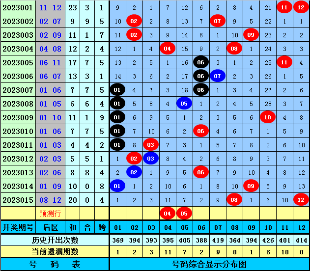 前区012路分析:上期前区012路比为1:3:1,1路号码表较热,最近30期前区012路比为48:48:54,2路号码表现活跃;最近10期前区012路比为16:23:21,本期预计前区012路号码平衡出现,参考012路比2:1:2。