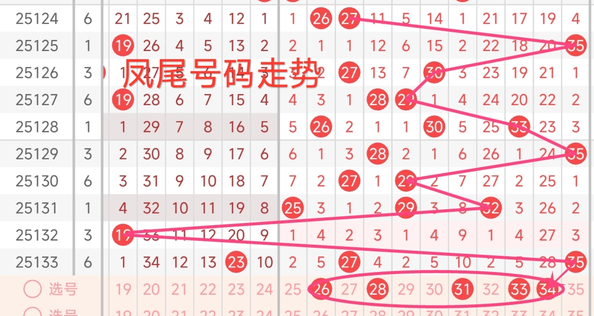 红球三区推荐(25~35):上期红三区开出2枚号码,号码为27、35,本期红三区建议出号1-3枚,本期红三区推荐关注号26、28、31、33、34。