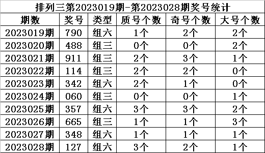 上期回顾:排列三第2023028期开奖:127,质合比为3:0,奇偶比为1:2,大小比为2:1。