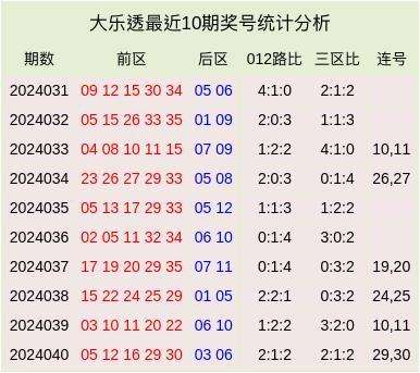 上期大乐透的开奖号码中,三区比为2:1:2,012路比为2:1:2,开出1组连号29,30