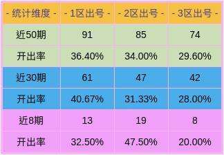 近50期,一区出号91个,二区出号85个,三区出号74个,三区数据比对1分区出号较多。