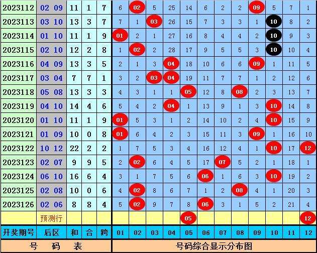后区分析:后区开出奖号02和06,近5期后区奖号大小比为5:5,分别开出:全大、一大一小、一大一小、一大一小、全小,本期后区预计小号热出,关注全小组合05、12。