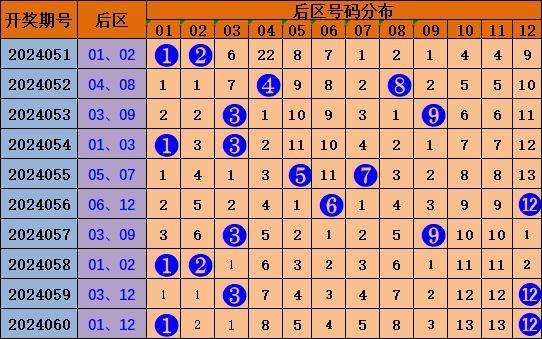 上期开出号码01 12,为奇偶形态,近10期后区奇奇形态4次,奇偶形态4次,偶偶形态2次,偶奇形态0次,综合分析,本期预测推荐后区以奇偶形态开出,推荐号码02 07。