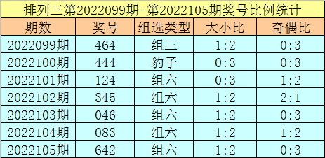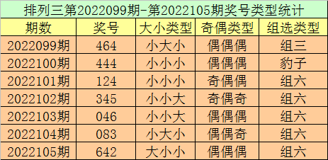 排列三第2022105期回顾:奖号642,奇偶比0:3,大小比1:2,和值12,类型:组六。