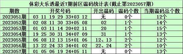 体彩大乐透第2023058期前区冷温热号码分析:(定义:遗漏0-3期号码为热码,遗漏4-9期号码为温码,遗漏9期以上号码为冷码)