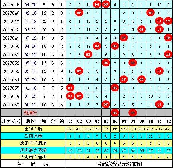 上期回顾:体彩大乐透第2023057期奖号为:01 05 06 19 24 + 05 11,各位号码遗漏期数分别为:3期、15期、1期、2期、0期 + 4期、3期,前区遗漏总期数为21期,后区遗漏总期数为7期。