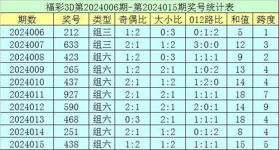 上期回顾:福彩3D第2024015期开奖号码为438,组选类型为组六,奇偶比为1:2,大小比为1:2。