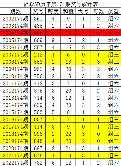 从以上统计可以看出,历年3D第175期开出了4次组三号码,开出了16次组六号码。组六号码出现概率大,本期预计开出组六号码。