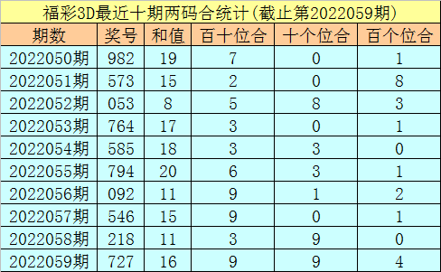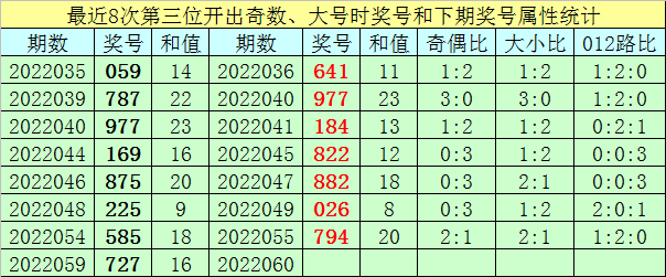 上期回顾:福彩3D第2022059期开出奖号为727,奖号奇偶比为2:1,大小比为2:1,012路比0:2:1。