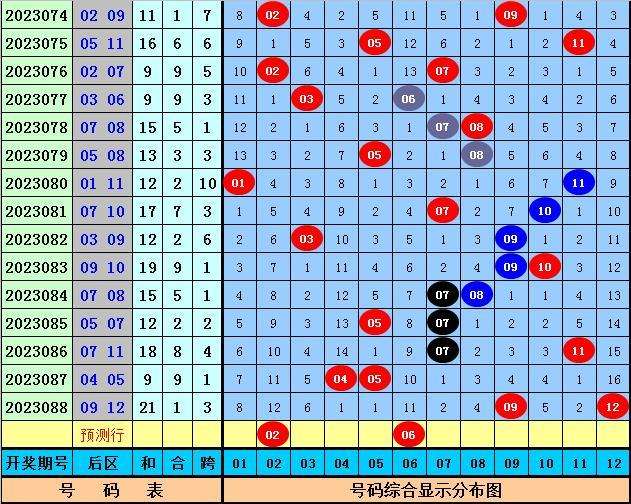 后区分析:上期后区开出号码09和12,最近10期后区奖号奇偶比为14:6,大小比为14:6,本期后区看好号码02、03、06、07、09,后区单挑两码02、06。