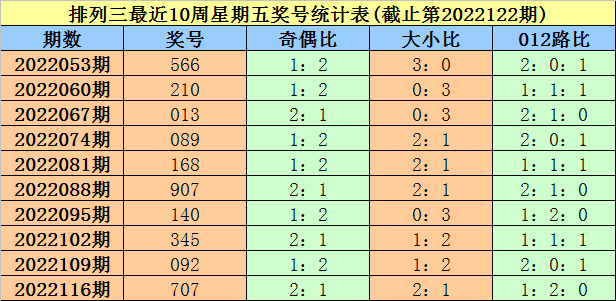 上期回顾:排列三第2022122期奖号为357。其中奖号奇偶比为3:0,大小比为2:1,012路比为1:1:1。