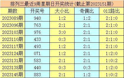 三、体彩排列三前9周星期日奖号分别开出:940-763-976-433-493-071-583-440-883,其中号码012路比为14:9:4,奇偶比为14:13,大小比为12:15;