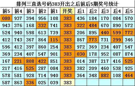 四、排列三直选号码383历史上开出10次,其前后五期奖号分别为: