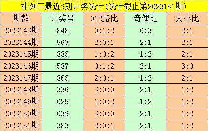 一、排列三第2023151期开出号码383,其奇偶比为2:1,大小比为1:2,号码012路比为2:0:1。该号码直选历史上出现了10次。