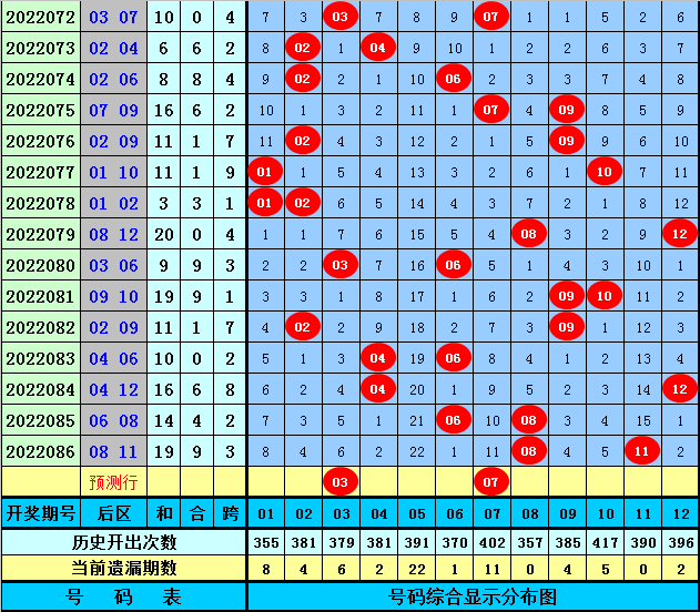 后区分析(定义:01-04为一区,05-08为二区,09-12为三区):上期后区开出奖号08和11二区和第三区和区,,最近10期后区三个区间落号个数比为7:6:7,本期后区看好第二区号码大热,注意两码03、07。