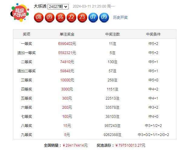大乐透第24027期开奖。当期开奖号码为:前区08 09 16 22 23,后区07 09。当期前区号码大小比为2:3,奇偶比为2:3,三区比2:3:0;前区开出1组连号22 23;后区开出大大组合07 09。