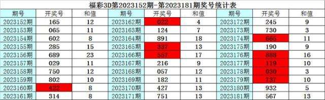 上期回顾:福彩3D第2023181期奖号为:567,其中奖号组选类型为:组六,奇偶比为2:1,大小比为3:0,012路比为1:1:1,和值为18,跨度为2。