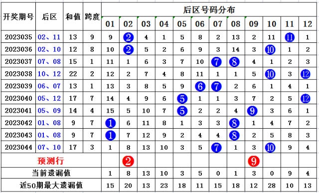 后区冷热分析(最近5期未开出的号码为冷号):上期大乐透后区开出号码07 10,近十期开出冷冷形态0次,冷热形态3次,热冷形态3次,热热形态4次。本期推荐冷热态开出,参考后区号码02 09。