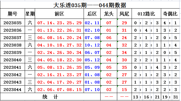 上期回顾,大乐透第2023044开奖,本期奖号:前区02 06 07 08 15;后区07 10,当期前区号码大小比为0:5,三区比4:1:0,奇偶比2:3。前区开出连号06 07 08,开出重号02。