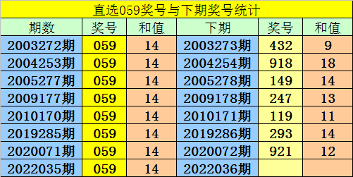第2022035期3D奖号为:059,历史上该号码直选开出8次,下期号码分别为:432、918、149、247、119、293、921。