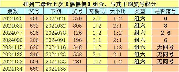 开奖回顾:排列三第2024134期开奖号码为:660。奖号类型为:组三,大小类型为:大大小,奇偶类型为:偶偶偶,无重号。