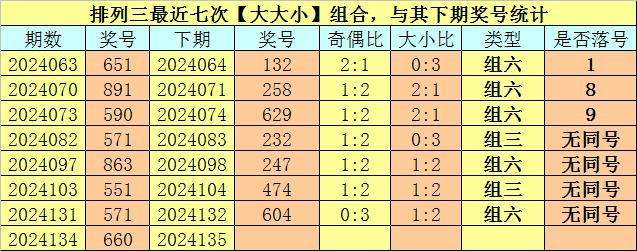 大小分析:排列三上期开出号码660,大小类型为【大大小】,最近七次开出大小类型大大小的奖号分别为:651、891、590、571、863、551、571,其下期分别开出号码:132、258、629、232、247、474、604。其中号码大小比为7:14,小号明显表现活跃,短期内没有转冷的迹象,本期看好小号再次热出,预计出现2个小号。