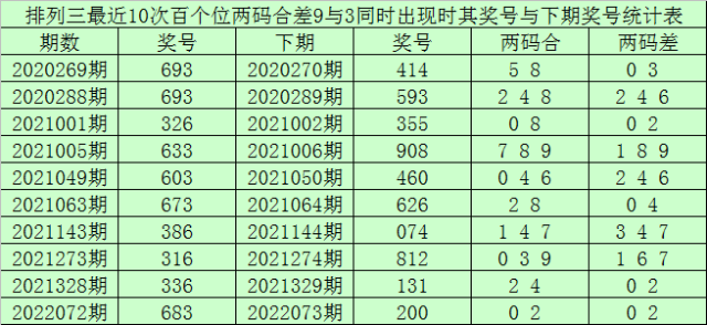 百个位合差分析:上期奖号百个位开出63组合,两码合为9,两码差为3,最近10次百个位两码合9与两码差3同时出现时,其奖号和下期奖号分别为: