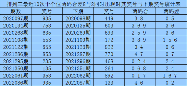 从以上统计可以看出,十个位两码合差8与2同时出现之后其下期两码合差表现最热的4个分别为:0236,本期十个位两码合差可以参考这四码中的数据。