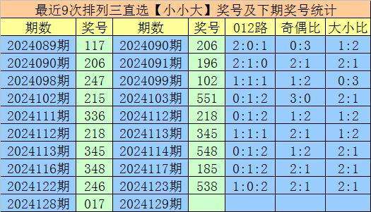 上期回顾:排列三第2024128期奖号为017,组六,大小比开出1:2,直选分布为:小小大。