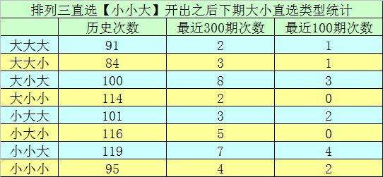1。排列三第2024128期奖号开出017,大小直选分布为:小小大,在历史开奖中直选【小小大】分布已开出821期,在前9次直选【小小大】分布中,出现奖号为:117-206-247-215-336-218-345-348-246,组三开出2期,组六开出7期。