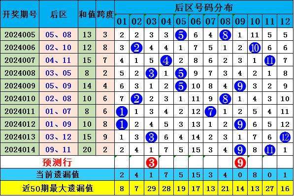 2路奖号:上期出现1个:05, 表现一般,在最近10期开奖中,2路前区出现14个,走势较冷,本期看好2路前区开出0个。
