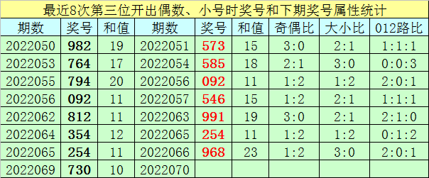 前7次第三位号码开出偶数、小号时奖号分别为:982、764、794、092、812、354、254,其中奇偶总比例为9:12,有2期奇偶比与上期奇偶比相同;号码大小总比例为10:11,有4期奖号大小比与上期大小比相同;