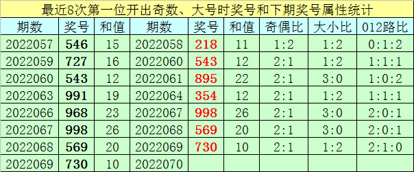 前7次第一位号码开出奇数、大号时奖号分别为:546、727、543、991、968、998、569,其中奇偶总比例为13:8,有4期奇偶比与上期奇偶比相同;号码大小总比例为16:5,有1期奖号大小比与上期大小比相同;