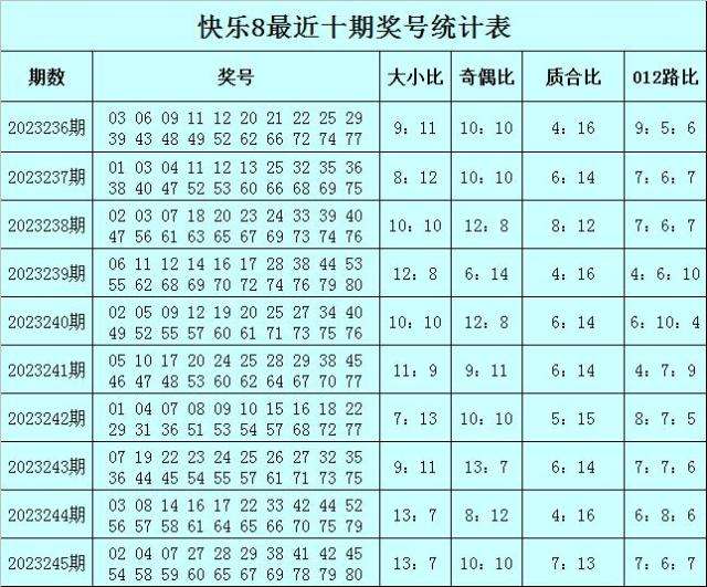 福彩快乐8第2023245期开奖回顾:02 04 07 27 28 29 38 41 42 45 54 58 59 60 65 67 69 78 79 80,其中奖号大小比开出13:7,奇偶比开出10:10,质合比开出7:13,012路比开出7:6:7。