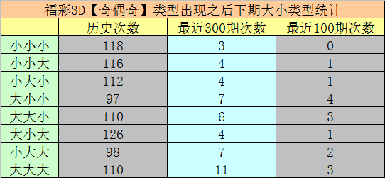 一、福彩3D上期奖号为169,大小类型开出:小大大,历史上该大小类型奖号共出现888次,最近7次【小大大】奖号分别开出:287、266、498、379、285、086、059,其中组三号码出现1次,组六号码出现6次。