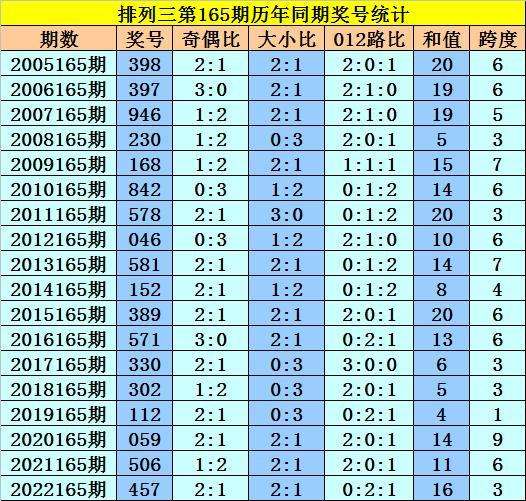 第165期历史同期开奖中,百位号码振幅分别为:0-6-7-1-7-3-5-5-4-2-2-2-0-2-1-5-1,波动范围在0-9之间,012路号码比例开出8:4:6,大小号码比例开出6:12,奇偶号码比例开出13:5,本期注意百位开出0路号码,一码看好3。