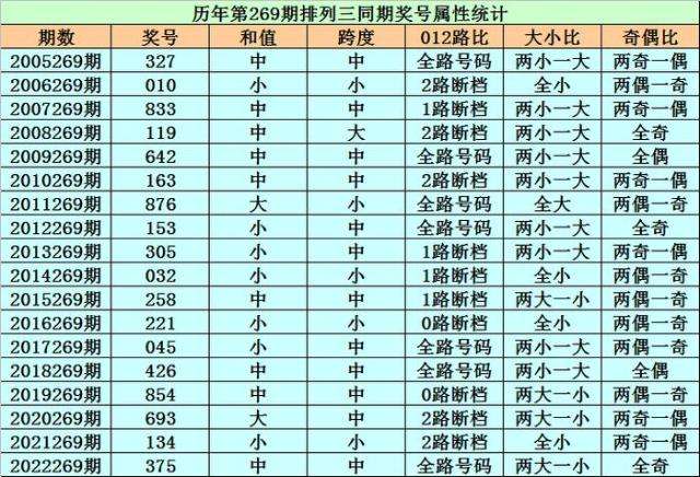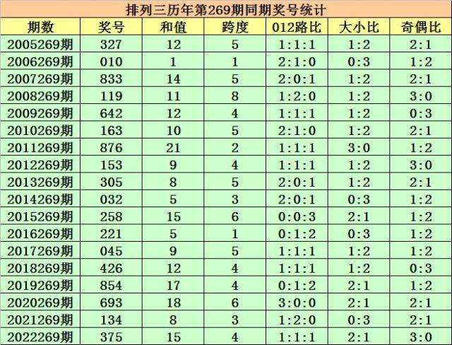 历史上第2023269期排列三已开出18期奖号了,历年同期奖号分别为:327、010、833、119、642、163、876、153、305、032、258、221、045、426、854、693、134、375,详细统计见下表: