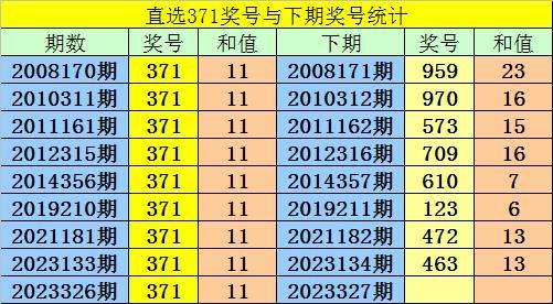 第2023326期3D奖号为:371,历史上该号码直选开出9次,下期号码分别为:959、970、573、709、610、123、472、463。